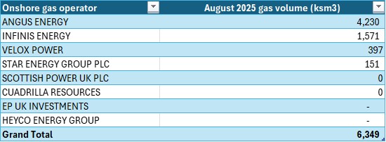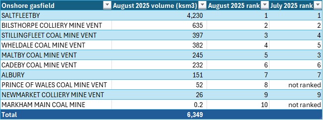 There was no production from 14 onshore fields in August 2025, according to the data. This was the same total as in July 2025. But in August 2025 Prince of Wales and Mark Main coal vents recorded some production, while Elswick and Askern had zero production.