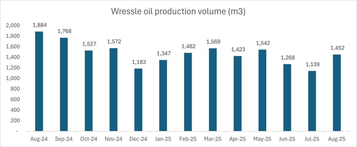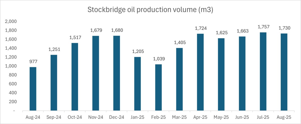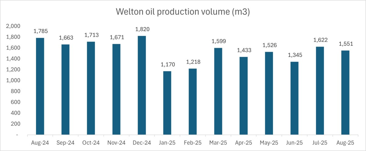 July 2025 11,806bopd, June 2025 11,940bopd, May 2025 12,490bopd, April 2025 12,441bopd, March 2025 12,310 bopd, February 2025 12,651bopd, January 2025 12,393bopd, December 2024 12,538bopd, November, 12,395bopd, October 11,000bopd, September 11,193 bopd, August 11,776 bopd, July 12,314 bopd