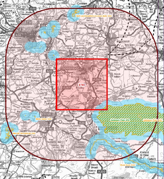 This block has European sites within it, or within 1km of the block boundary. In general, land within approximately 1km of a European site is considered to be of a potentially sensitive nature (due to its proximity to the European site) such that mitigation and/or alternative siting may be required by authorities further considering HRA issues for specific project-level operations. .- In some instances, bird species that are associated with SPAs and some Ramsar sites may rely on non-designated habitats beyond the European site boundaries, and so could be vulnerable to activities occurring outside the designated site itself. Land within 10kmof an SPA, or a Ramsar site designated for its bird populations, is therefore considered to be of a potentially sensitive nature (due to its proximity to the European site) such that mitigation and/or alternative siting may be required by authorities further considering HRA issues for specific project-level operations. The European sites potentially vulnerable in or near this block are Salisbury Plain SPA.- Riparian or estuarine habitats and species may be sensitive to impacts on tributary watercourses by activities. Land that is within 10km of a riparian or estuarine European site, and which is also within 200 metres of a contributory watercourse to that site, is considered to be of a potentially sensitive nature (due to its potential connectivity to a European site) such that mitigation and/or alternative siting may be required by authorities further considering HRA issues for specific project-level operations. The European sites potentially vulnerable in or near this block are River Avon SAC.- Bat species usually rely on non-designated habitats beyond the European site boundaries (bats can commute and forage for many kilometres beyond their core habitat), and so could be vulnerable to activities occurring outside the designated site itself. Land withinthe 10km of an SAC designated for its bat populations is considered to be of a potentially sensitive nature (due to its proximity to the European site) such that mitigation and/or alternative siting may be required by authorities further considering HRA issues for specific project-level operations. The European sites potentially vulnerable in or near this block are Bath and Bradford-on-Avon Bats SAC, Mells Valley SAC.- Some of European site interest features (e.g. birds species; fish; marine mammals) are potentially sensitive to noise or vibration effects associated with Stage A activities (as well as Stage B, C and D activities). Land within approximately 1km of a European site supporting noise or vibration sensitive features is considered to be of a potentially sensitive nature (due to its proximity to the European site) such that mitigation and/or alternative siting may be required by authorities further considering HRA issues for specific project-level operations. The European sites with features potentially vulnerable to this in or near this block are Salisbury Plain SPA, River Avon SAC.