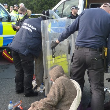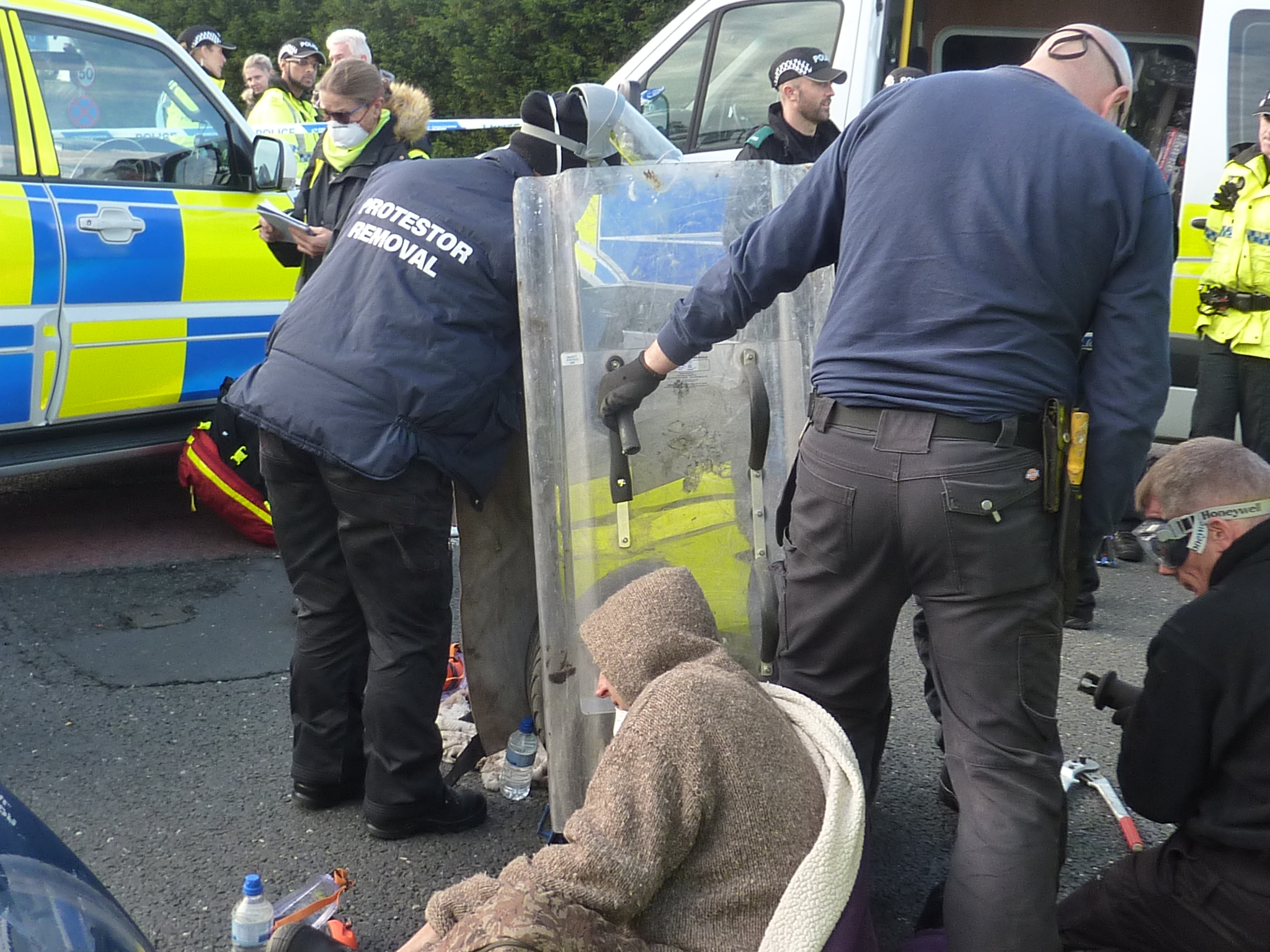 Police protester removal team working to release two campaigners who locked together outside the farm run the owner of Cuadrilla’s shale gas site, 15 October 2018. Photo: DrillOrDrop