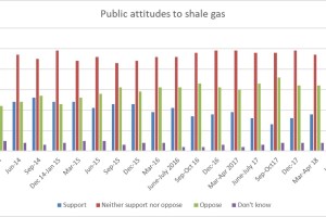 The government has resumed its quarterly survey of public attitudes to fracking and shale gas. The latest results, published this morning, show support for fracking stands at 15%, down 3 percentage points, and opposition at 31%, down 1 point.