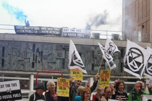 Climate campaigners climbed onto to the roof of a council headquarters today in their bid to end pension fund investment in fossil fuels.