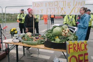 Campaigners from across the UK gathered outside Cuadrilla’s shale gas site near Blackpool for a demonstration today in support of food growing and against fracking.