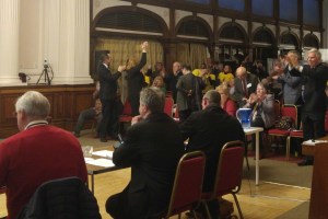 Opponents of INEOS plans to explore for shale gas in a Derbyshire village stood in applause as councillors voted against the scheme this evening.