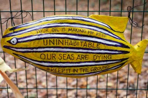 Opponents of oil production in Surrey gathered to decorate fencing outside the Horse Hill site this morning as a legal challenge began at the High Court.